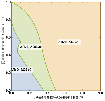 この設定を分析して規制が存在しない場合と存在する場合を比較した結果、消費者が獲得できるデータ提供から得られる便益(x)と1単位の消費者データから得られる利益(α)の合計が小さいと規制が企業利潤Πや消費者余剰CSを改善する傾向にあり(ΔΠ>0,ΔCS>0)、xとαの合計が中程度だと企業利潤は改善するものの消費者余剰は悪化して(ΔΠ>0,ΔCS<0)、xとαの合計が大きいと企業利潤と消費者余剰は悪化します(ΔΠ<0,ΔCS<0)。